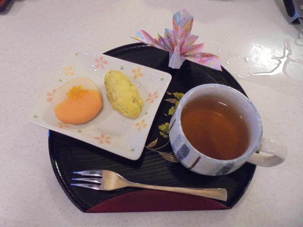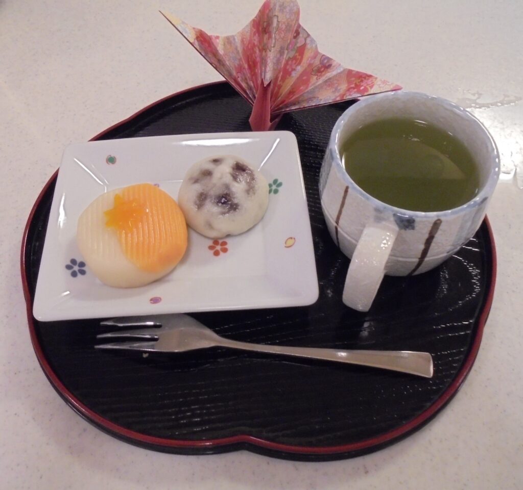 上生菓子とお茶を召し上がっていただきました。お祝いの鶴も一緒にそっと添えさせて・・・