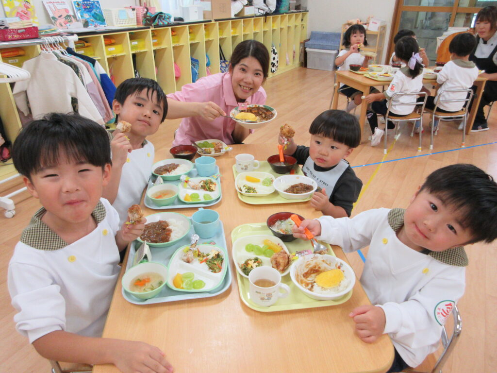 給食は、ほし・つき・にじ組さん一緒にいただきま~す🚩