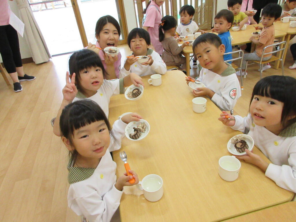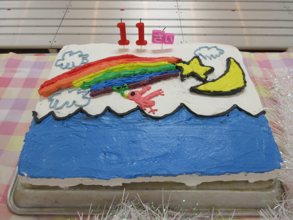 このケーキは、保育園のロゴを年長児が描き、それをケーキにしました✨