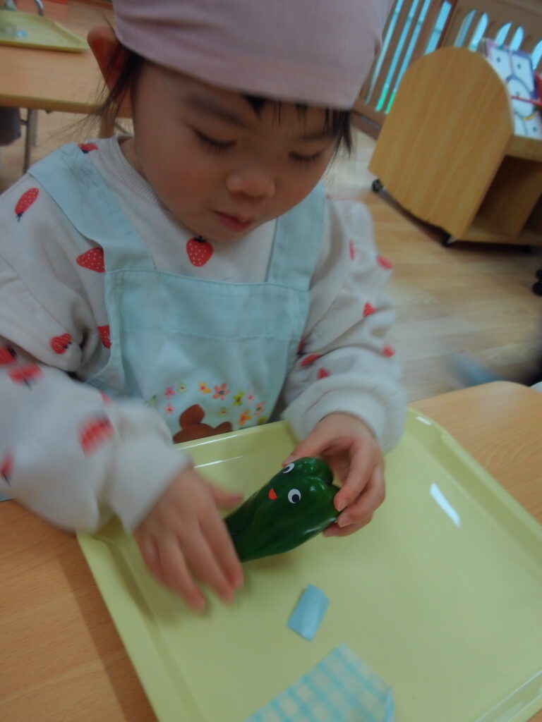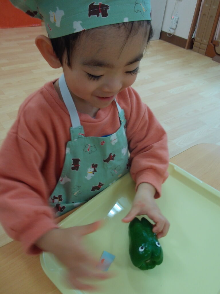 『✨グリーンマントのピーマンマン✨』を、みんなで見た後は、ピーマンマン作りに挑戦しました👆