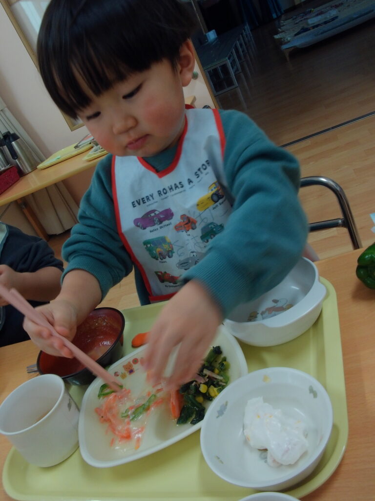 にこにこキッチンで習った箸を使って上手に食べることができていますね✨